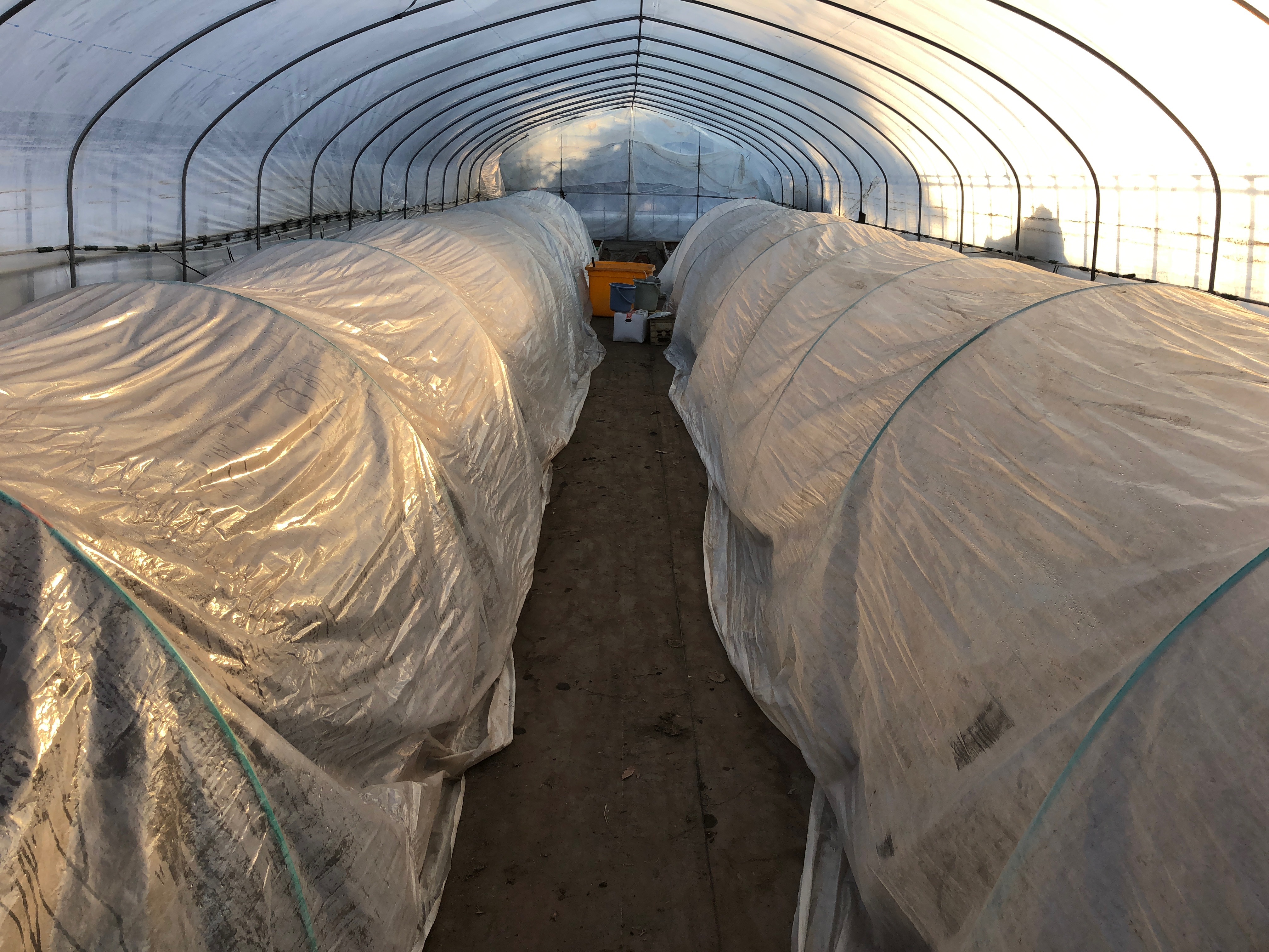 少しづつ大きくなってやっとこさ1.5枚ぐらいまで開いて来ました。うちの親床ハウスは土手にある木が大きくなりすぎて日当たりが悪いので朝一温度が上がりづらい為今年は外張りを奮発してテキナシ5の0.15を買いました‼お値段は普通のPOビニールの2倍近くした気がするなぁ。。