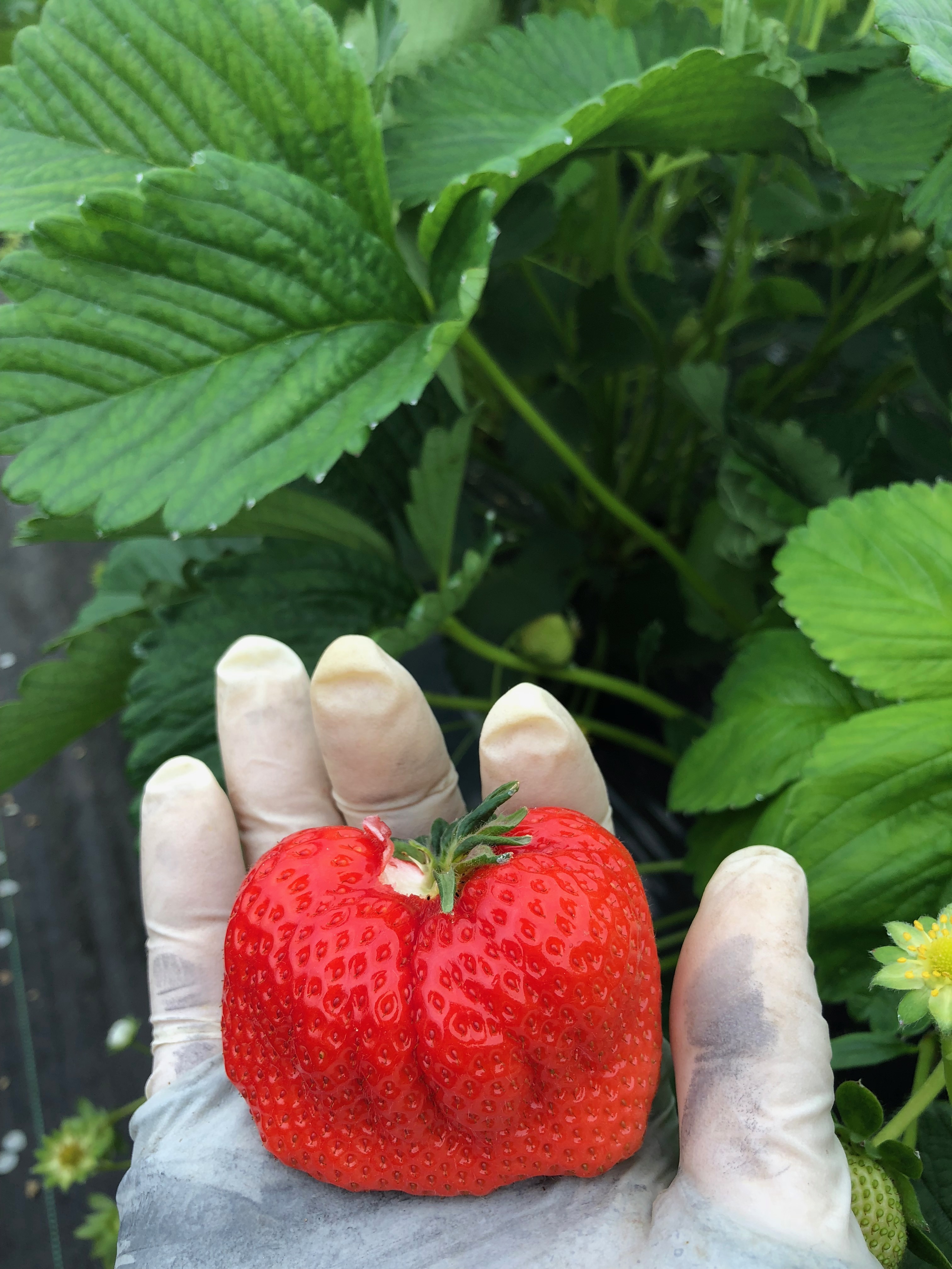 今年導入した暖房機ダッチジェットのお陰か、ハウス内CO2濃度が高く株のサイズが大きく通路が狭くなっております。なるべくいちごを踏まない様に歩いて頂けると幸いです。