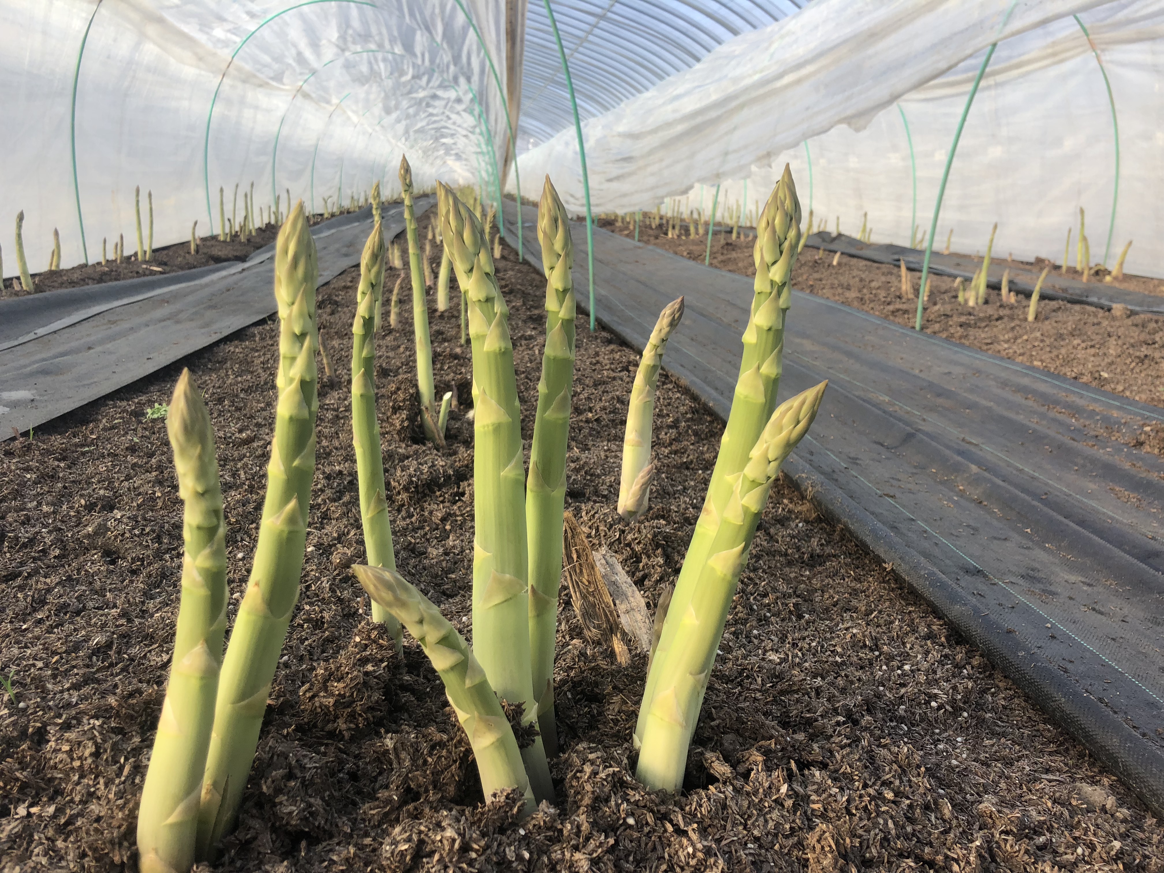 今年はアスパラを少しでも早く収穫しようと思い、例年よりも二週間早くビニールを張りましたが、今年栗山は積雪が過去最高を上回るペースでの降雪で2月20日辺りまではとんでもなくありました。ですがそこから二週間晴天が続き順調に融雪が進みました。結果的には例年通りぐらいでしたが、アスパラの上にはもっこり雪が乗ってました。笑