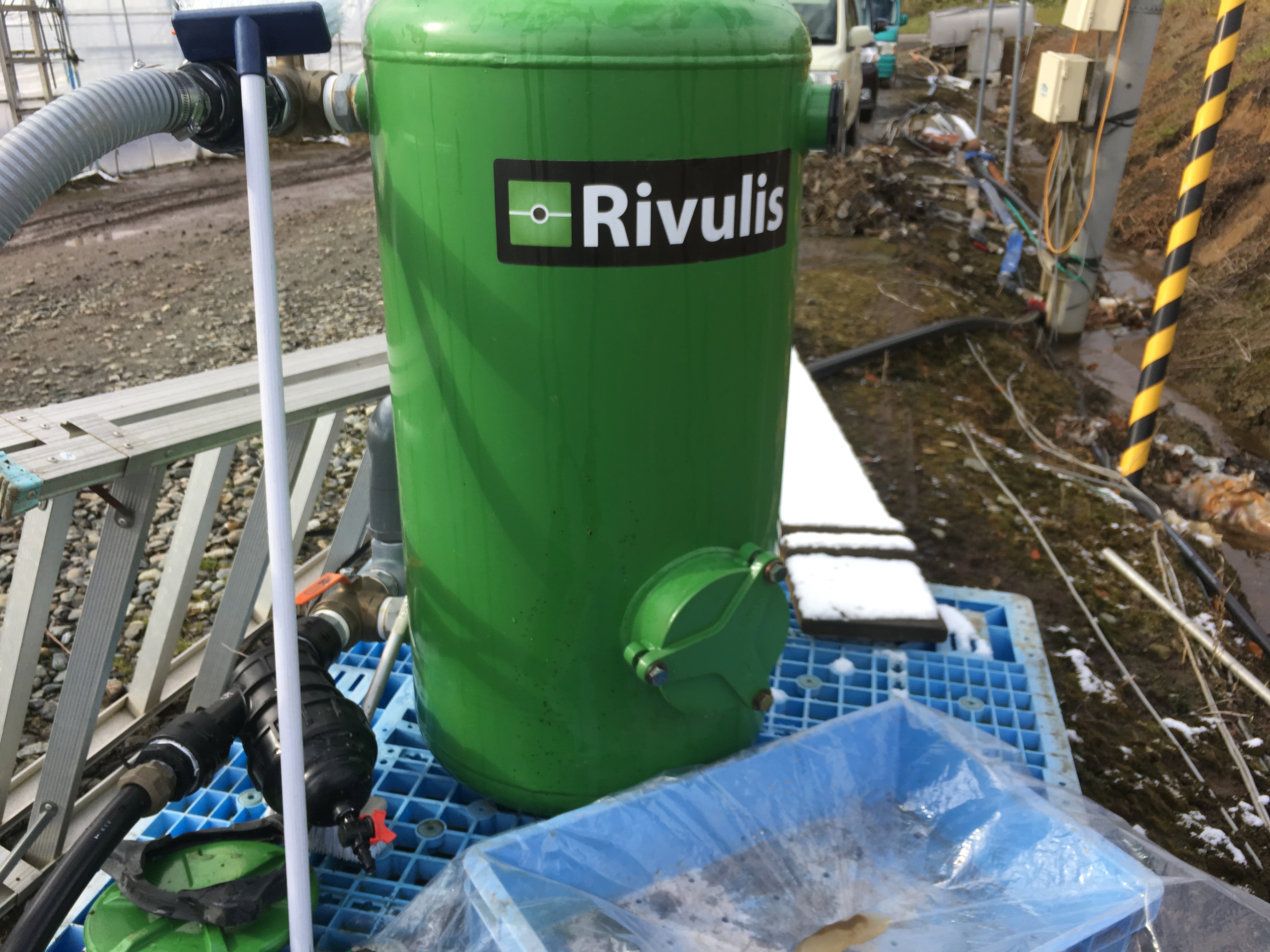 溜め池からサンドフィルターでろ過して2000Lのタンクに貯めてから潅水という流れになります。