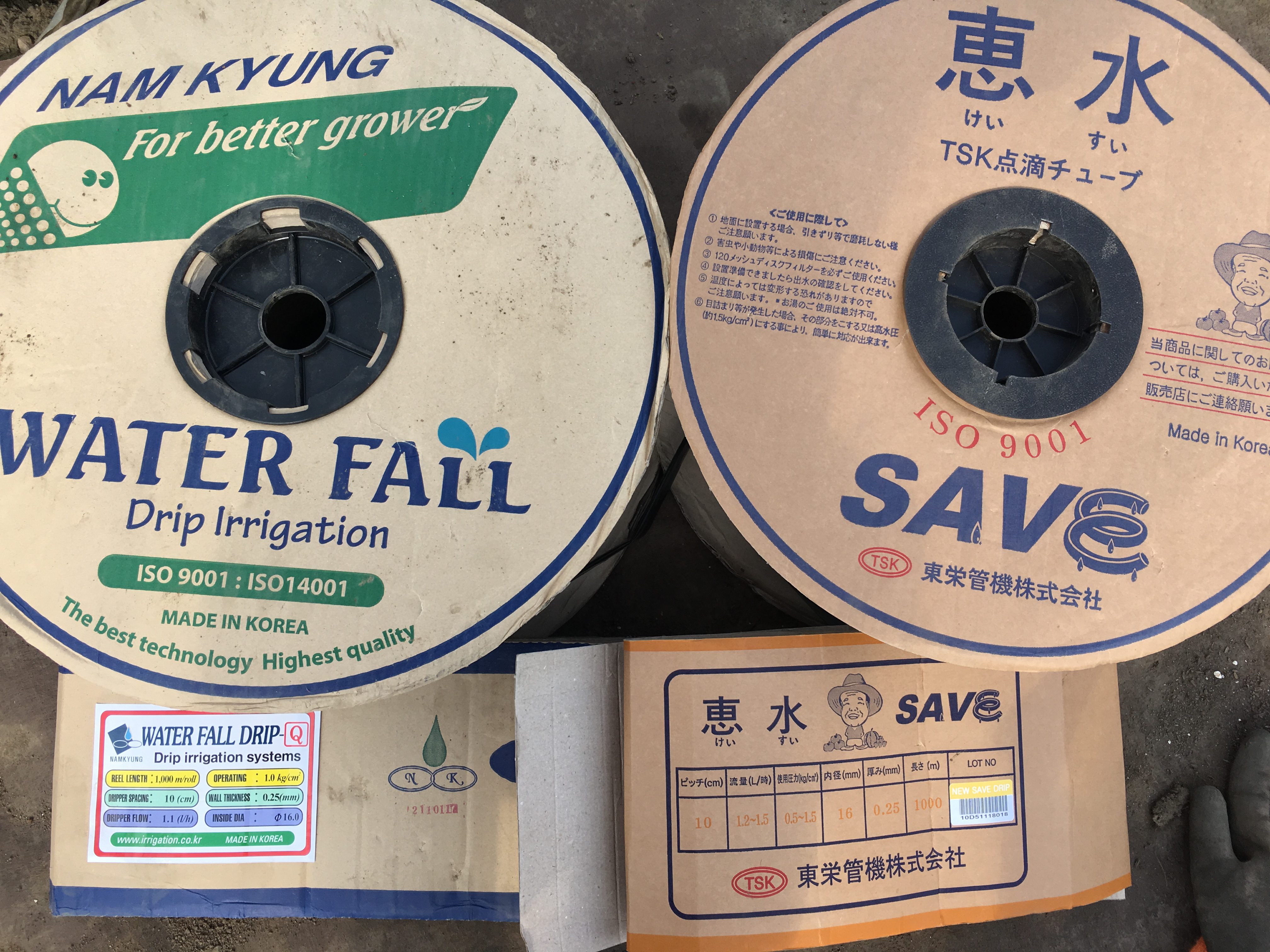 写真左側が、恵水。右が韓国製です。性能は同じでピッチ10cm、流量が1.1l ,厚み同じく0.25mm,内径同じく16mm,違うとすれば流量で韓国製で1.1l/h