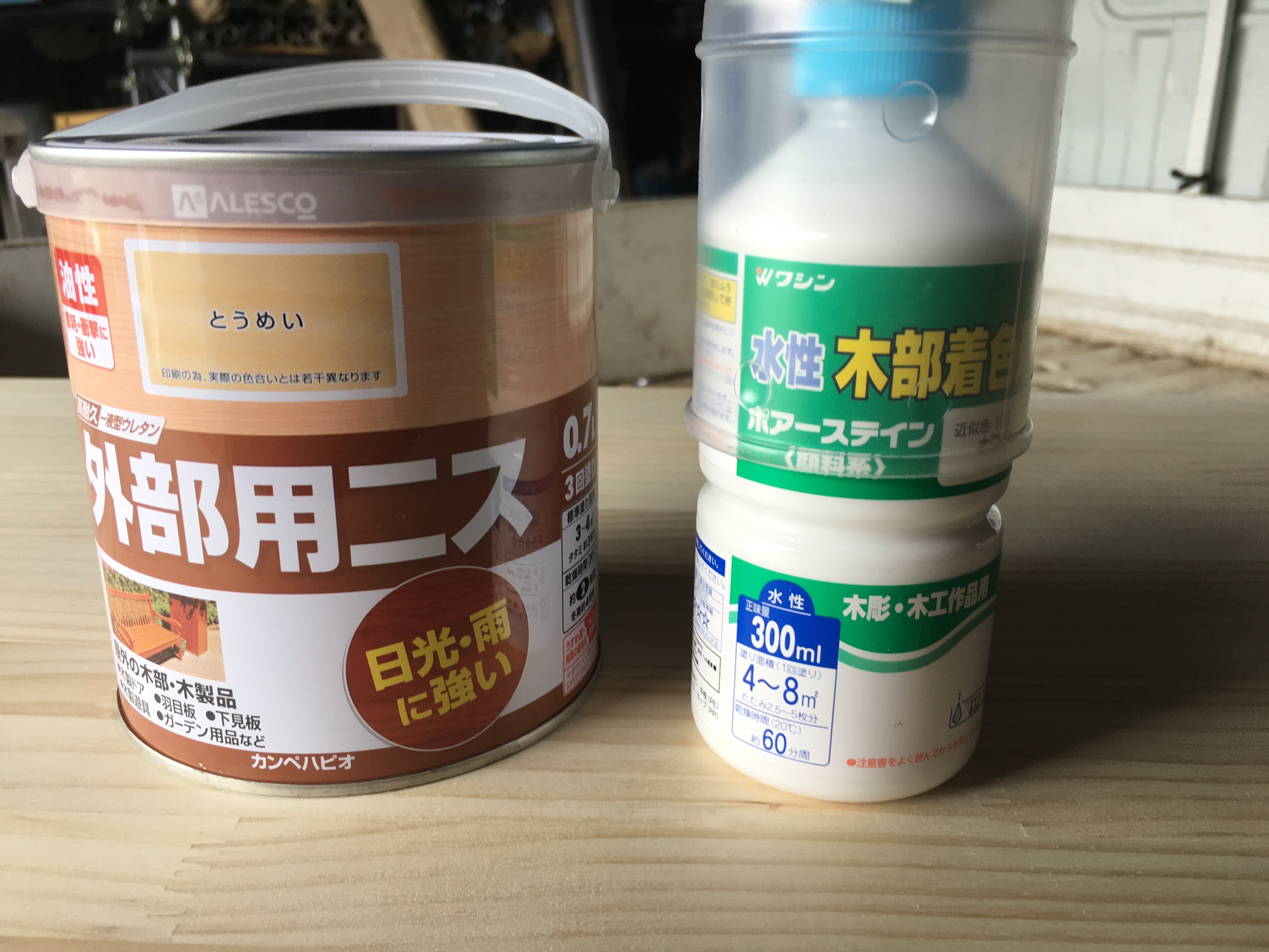 パイン材に水性白に水性塗料で2度3度塗り色を濃くし、外部用のニスでこれまた2度3度乾く度に重ね塗りをし頑丈な仕上がりにしていきってます。